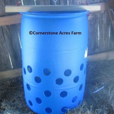 We have also started making 55 gallon size feeders. While we personally prefer the smaller white barrels as the goats seem to not be able to reach all the hay in the 55 gallon barrels. However this does work to our advantage in a couple of our hard to reach pens. We can stuff a feeder full then instead of hauling hay out to those pens each day we just rearrange the hay left in the center. This gives us two or three days without hauling hay to those barns! A full bale of hay will fit into the 55 gallon feeders. Lids will be on the 55 gallon feeders.